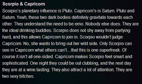 Find out capricorn man and scorpio woman compatibility characteristics. When scorpio man and capricorn woman come together whether in a short term or long term relationship they share a lot of common ground with each other. Capricorn will satisfy erotic scorpio because capricorn has profound stamina.